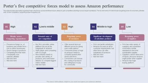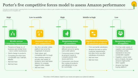 This slide provides information regarding Porters five forces assessment that Amazon utilizes to gain competitive advantage across target marketplace. The key elements of model include bargaining power of consumers, potential entry of new competitors, bargaining power of suppliers, etc. Are you searching for a Porters Five Competitive Forces Model To Assess Amazon Performance Slides PDF that is uncluttered, straightforward, and original Its easy to edit, and you can change the colors to suit your personal or business branding. For a presentation that expresses how much effort you have put in, this template is ideal With all of its features, including tables, diagrams, statistics, and lists, its perfect for a business plan presentation. Make your ideas more appealing with these professional slides. Download Porters Five Competitive Forces Model To Assess Amazon Performance Slides PDF from Slidegeeks today.