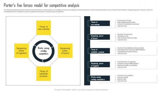 The following slide presents Porter five forces framework used to perform competitive analysis for analyzing industry weakness. It showcases elements such as threat of new entrants, bargaining power of buyers, threat of substitute product, bargaining power of suppliers and rivalry among existing competitors. Present like a pro with Porters Five Forces Model For Competitive Analysis Comprehensive Guide Pictures Pdf Create beautiful presentations together with your team, using our easy-to-use presentation slides. Share your ideas in real-time and make changes on the fly by downloading our templates. So whether you are in the office, on the go, or in a remote location, you can stay in sync with your team and present your ideas with confidence. With Slidegeeks presentation got a whole lot easier. Grab these presentations today. The following slide presents Porter five forces framework used to perform competitive analysis for analyzing industry weakness. It showcases elements such as threat of new entrants, bargaining power of buyers, threat of substitute product, bargaining power of suppliers and rivalry among existing competitors.