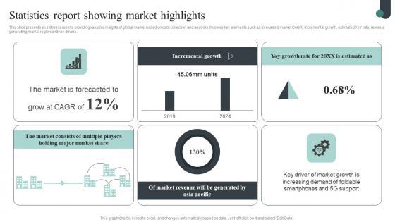 This slide presents an statistics reports providing valuable insights of global market based on data collection and analysis. It covers key elements such as forecasted market CAGR, incremental growth, estimated YoY rate, revenue generating market region and key drivers. The Competitive Intelligence Guide To Determine Market Statistics Report Showing Introduction Pdf is a compilation of the most recent design trends as a series of slides. It is suitable for any subject or industry presentation, containing attractive visuals and photo spots for businesses to clearly express their messages. This template contains a variety of slides for the user to input data, such as structures to contrast two elements, bullet points, and slides for written information. Slidegeeks is prepared to create an impression. This slide presents an statistics reports providing valuable insights of global market based on data collection and analysis. It covers key elements such as forecasted market CAGR, incremental growth, estimated YoY rate, revenue generating market region and key drivers.