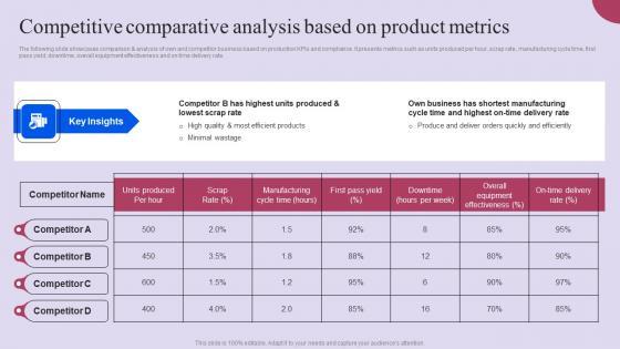 The following slide showcases comparison and analysis of own and competitor business based on production KPIs and compliance. It presents metrics such as units produced per hour, scrap rate, manufacturing cycle time, first pass yield, downtime, overall equipment effectiveness and on time delivery rate. Want to ace your presentation in front of a live audience Our Competitive Comparative Analysis Based On Product Metrics Ppt Icon Slide Pdf can help you do that by engaging all the users towards you. Slidegeeks experts have put their efforts and expertise into creating these impeccable powerpoint presentations so that you can communicate your ideas clearly. Moreover, all the templates are customizable, and easy to edit and downloadable. Use these for both personal and commercial use. The following slide showcases comparison and analysis of own and competitor business based on production KPIs and compliance. It presents metrics such as units produced per hour, scrap rate, manufacturing cycle time, first pass yield, downtime, overall equipment effectiveness and on time delivery rate.