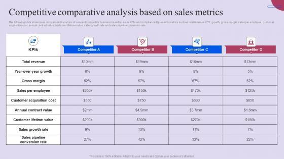The following slide showcases comparison and analysis of own and competitor business based on sales KPIs and compliance. It presents metrics such as total revenue, YOY growth, gross margin, sales per employee, customer acquisition cost, annual contract value, customer lifetime value, sales growth rate and sales pipeline conversion rate. There are so many reasons you need a Competitive Comparative Analysis Based On Sales Metrics Ppt File Designs Pdf. The first reason is you can not spend time making everything from scratch, Thus, Slidegeeks has made presentation templates for you too. You can easily download these templates from our website easily. The following slide showcases comparison and analysis of own and competitor business based on sales KPIs and compliance. It presents metrics such as total revenue, YOY growth, gross margin, sales per employee, customer acquisition cost, annual contract value, customer lifetime value, sales growth rate and sales pipeline conversion rate.