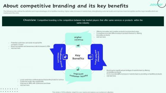 The following slide outlines the definition and major advantages of competitive branding. Higher sales, increase in market share, strengthening customer loyalty and improves brand recognition are the major benefits which are mentioned in the slide.Find a pre designed and impeccable About Competitive Branding And Its Key Strategies For Sales And Profitability Topics Pdf. The templates can ace your presentation without additional effort. You can download these easy to edit presentation templates to make your presentation stand out from others. So, what are you waiting for Download the template from Slidegeeks today and give a unique touch to your presentation. The following slide outlines the definition and major advantages of competitive branding. Higher sales, increase in market share, strengthening customer loyalty and improves brand recognition are the major benefits which are mentioned in the slide.