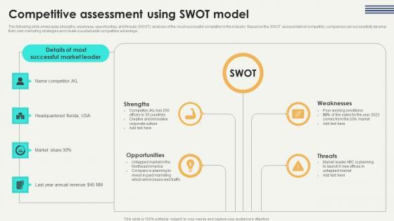 The following slide showcases strengths, weakness, opportunities, and threats SWOT analysis of the most successful competitor in the industry. Based on the SWOT assessment of competitor, companies can successfully develop their own marketing strategies and create a sustainable competitive advantage. If your project calls for a presentation, then Slidegeeks is your go to partner because we have professionally designed, easy to edit templates that are perfect for any presentation. After downloading, you can easily edit Competitive Assessment Digital Marketing Strategies Improve Enterprise Sales Infographics Pdf and make the changes accordingly. You can rearrange slides or fill them with different images. Check out all the handy templates The following slide showcases strengths, weakness, opportunities, and threats SWOT analysis of the most successful competitor in the industry. Based on the SWOT assessment of competitor, companies can successfully develop their own marketing strategies and create a sustainable competitive advantage.