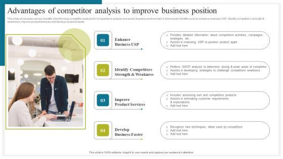 This slide showcases various benefits of performing competitor analysis for companies to analyze and asses business environment. It showcases benefits such as enhance business USP, identify competitors strength and weakness, improve product services and develop business faster. Boost your pitch with our creative Advantages Of Competitor Analysis To Improve Business Position Comprehensive Guide Summary Pdf Deliver an awe-inspiring pitch that will mesmerize everyone. Using these presentation templates you will surely catch everyones attention. You can browse the ppts collection on our website. We have researchers who are experts at creating the right content for the templates. So you do not have to invest time in any additional work. Just grab the template now and use them. This slide showcases various benefits of performing competitor analysis for companies to analyze and asses business environment. It showcases benefits such as enhance business USP, identify competitors strength and weakness, improve product services and develop business faster.