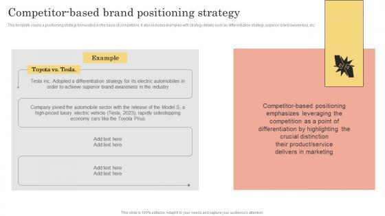 This slide covers a positioning strategy formulated on the basis of competitors. It also includes examples with strategy details such as differentiation strategy, superior brand awareness, etc. Are you in need of a template that can accommodate all of your creative concepts This one is crafted professionally and can be altered to fit any style. Use it with Google Slides or PowerPoint. Include striking photographs, symbols, depictions, and other visuals. Fill, move around, or remove text boxes as desired. Test out color palettes and font mixtures. Edit and save your work, or work with colleagues. Download Competitor Based Product Positioning Strategy Comprehensive Guide On How To Successfully Template PDF and observe how to make your presentation outstanding. Give an impeccable presentation to your group and make your presentation unforgettable.