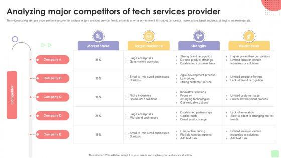 This slide provides glimpse about performing customer analysis of tech solutions provider firm to under its external environment. It includes competitor, market share, target audience, strengths, weaknesses, etc. While your presentation may contain top-notch content, if it lacks visual appeal, youre not fully engaging your audience. Introducing our Analyzing Major Competitors Detailed Business Account PPT Sample Strategy SS V deck, designed to engage your audience. Our complete deck boasts a seamless blend of Creativity and versatility. You can effortlessly customize elements and color schemes to align with your brand identity. Save precious time with our pre-designed template, compatible with Microsoft versions and Google Slides. Plus, its downloadable in multiple formats like JPG, JPEG, and PNG. Elevate your presentations and outshine your competitors effortlessly with our visually stunning 100 percent editable deck. This slide provides glimpse about performing customer analysis of tech solutions provider firm to under its external environment. It includes competitor, market share, target audience, strengths, weaknesses, etc.