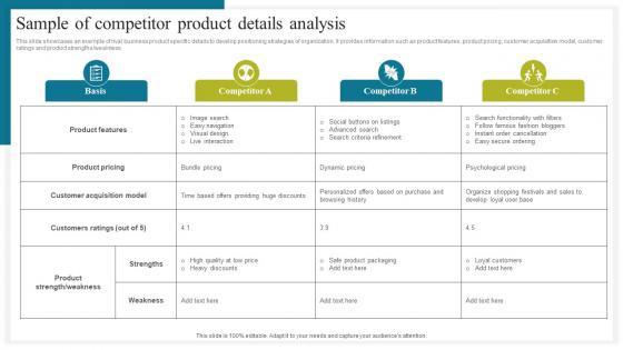 This slide showcases an example of rival business product specific details to develop positioning strategies of organization. It provides information such as product features, product pricing, customer acquisition model, customer ratings and product strengths weakness. If your project calls for a presentation, then Slidegeeks is your go-to partner because we have professionally designed, easy-to-edit templates that are perfect for any presentation. After downloading, you can easily edit Sample Of Competitor Product Details Analysis Comprehensive Guide Sample Pdf and make the changes accordingly. You can rearrange slides or fill them with different images. Check out all the handy templates This slide showcases an example of rival business product specific details to develop positioning strategies of organization. It provides information such as product features, product pricing, customer acquisition model, customer ratings and product strengths weakness.