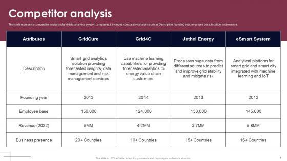 This slide represents comparative analysis of grid data analytics solution companies. It includes comparative analysis such as Description, founding year, employee base, location, and revenue. Want to ace your presentation in front of a live audience Our Competitor Analysis Smart Grid Analytics Investor Fund Raising Inspiration PDF can help you do that by engaging all the users towards you. Slidegeeks experts have put their efforts and expertise into creating these impeccable powerpoint presentations so that you can communicate your ideas clearly. Moreover, all the templates are customizable, and easy-to-edit and downloadable. Use these for both personal and commercial use. This slide represents comparative analysis of grid data analytics solution companies. It includes comparative analysis such as Description, founding year, employee base, location, and revenue.