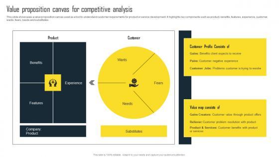 This slide showcases a value proposition canvas used as a tool to understand customer requirements for product or service development. It highlights key components such as product, benefits, features, experience, customer, wants, fears, needs and substitutes. Get a simple yet stunning designed Steps To Conduct Competitor Analysis Value Proposition Canvas For Competitive Analysis Structure PDF. It is the best one to establish the tone in your meetings. It is an excellent way to make your presentations highly effective. So, download this PPT today from Slidegeeks and see the positive impacts. Our easy-to-edit Steps To Conduct Competitor Analysis Value Proposition Canvas For Competitive Analysis Structure PDF can be your go-to option for all upcoming conferences and meetings. So, what are you waiting for Grab this template today.