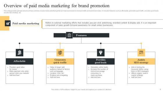 This slide provides glimpse about summary overview of paid media advertising that can help businesses to increase traffic and build brand value. It includes features such as affordable, generates quick traffic, provides good leads, assists SEO strategy, etc. Get a simple yet stunning designed Complete Guide Of Paid Media Marketing Techniques Overview Of Paid Media Graphics PDF. It is the best one to establish the tone in your meetings. It is an excellent way to make your presentations highly effective. So, download this PPT today from Slidegeeks and see the positive impacts. Our easy to edit Complete Guide Of Paid Media Marketing Techniques Overview Of Paid Media Graphics PDF can be your go to option for all upcoming conferences and meetings. So, what are you waiting for Grab this template today.
