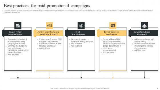This slide provides glimpse about key considerations for paid media marketing that help the businesses to boost conversion rate and Click Through Rate CTR. It includes budget review and optimization, review latest features in Google ads and others, etc. Take your projects to the next level with our ultimate collection of Complete Guide Of Paid Media Marketing Techniques Best Practices For Paid Promotional Portrait PDF. Slidegeeks has designed a range of layouts that are perfect for representing task or activity duration, keeping track of all your deadlines at a glance. Tailor these designs to your exact needs and give them a truly corporate look with your own brand colors they will make your projects stand out from the rest.