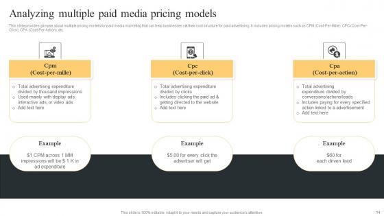 This slide provides glimpse about multiple pricing models for paid media marketing that can help businesses set their cost structure for paid advertising. It includes pricing models such as CPM Cost Per Mille, CPC Cost Per Click, CPA Cost Per Action, etc. Boost your pitch with our creative Complete Guide Of Paid Media Marketing Techniques Analyzing Multiple Paid Media Portrait PDF. Deliver an awe inspiring pitch that will mesmerize everyone. Using these presentation templates you will surely catch everyones attention. You can browse the ppts collection on our website. We have researchers who are experts at creating the right content for the templates. So you do not have to invest time in any additional work. Just grab the template now and use them.