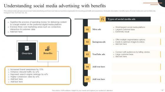 This slide provides glimpse about social media advertising and how it can help our business organization for boosting paid traffic and awareness. It includes description, benefits, types of social media ads such as Meta Ads, Instagram Ads, YouTube Ads, etc. If your project calls for a presentation, then Slidegeeks is your go to partner because we have professionally designed, easy to edit templates that are perfect for any presentation. After downloading, you can easily edit Complete Guide Of Paid Media Marketing Techniques Understanding Social Media Pictures PDF and make the changes accordingly. You can rearrange slides or fill them with different images. Check out all the handy templates.