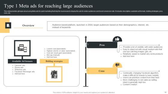 This slide provides glimpse about using Meta ads for paid marketing that help the businesses to display the ads for wider audiences and boost conversion rate. It includes description, available ad formats, bidding strategies, pros, cons, etc. This Complete Guide Of Paid Media Marketing Techniques Type 1 Meta Ads For Reaching Microsoft PDF is perfect for any presentation, be it in front of clients or colleagues. It is a versatile and stylish solution for organizing your meetings. The product features a modern design for your presentation meetings. The adjustable and customizable slides provide unlimited possibilities for acing up your presentation. Slidegeeks has done all the homework before launching the product for you. So, do not wait, grab the presentation templates today