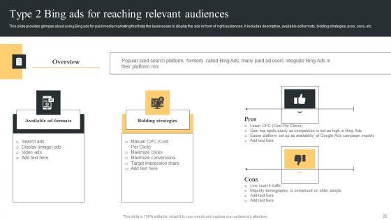 This slide provides glimpse about using Bing ads for paid media marketing that help the businesses to display the ads in front of right audiences. It includes description, available ad formats, bidding strategies, pros, cons, etc. Welcome to our selection of the Complete Guide Of Paid Media Marketing Techniques Type 2 Bing Ads For Reaching Formats PDF. These are designed to help you showcase your creativity and bring your sphere to life. Planning and Innovation are essential for any business that is just starting out. This collection contains the designs that you need for your everyday presentations. All of our PowerPoints are 100 percent editable, so you can customize them to suit your needs. This multi purpose template can be used in various situations. Grab these presentation templates today.