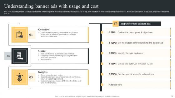 This slide provides glimpse about details of banner advertising which involves placement of rectangular ads on top, side or bottom of others website for paid promotions. It includes description, usage, cost, steps to create banner ads, etc. Slidegeeks is here to make your presentations a breeze with Complete Guide Of Paid Media Marketing Techniques Understanding Banner Ads Designs PDF With our easy to use and customizable templates, you can focus on delivering your ideas rather than worrying about formatting. With a variety of designs to choose from, you are sure to find one that suits your needs. And with animations and unique photos, illustrations, and fonts, you can make your presentation pop. So whether you are giving a sales pitch or presenting to the board, make sure to check out Slidegeeks first.