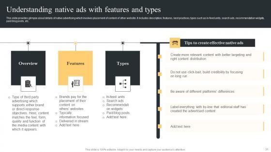 This slide provides glimpse about details of native advertising which involves placement of content of other website. It includes description, features, best practices, types such as in feed units, search ads, recommendation widgets, paid blog posts, etc. Do you have an important presentation coming up Are you looking for something that will make your presentation stand out from the rest Look no further than Complete Guide Of Paid Media Marketing Techniques Understanding Native Ads Structure PDF. With our professional designs, you can trust that your presentation will pop and make delivering it a smooth process. And with Slidegeeks, you can trust that your presentation will be unique and memorable. So why wait Grab Complete Guide Of Paid Media Marketing Techniques Understanding Native Ads Structure PDF today and make your presentation stand out from the rest.