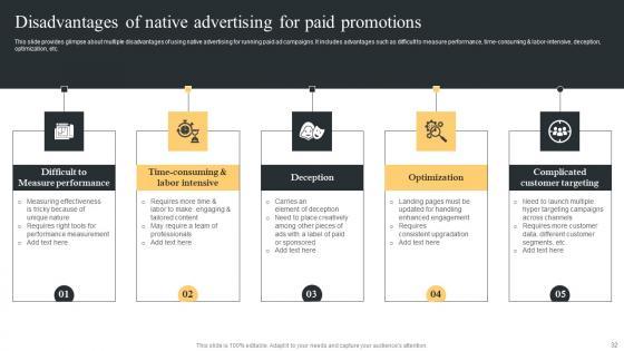 This slide provides glimpse about multiple disadvantages of using native advertising for running paid ad campaigns. It includes advantages such as difficult to measure performance, time consuming and labor intensive, deception, optimization, etc. Want to ace your presentation in front of a live audience Our Complete Guide Of Paid Media Marketing Techniques Disadvantages Of Native Advertising Inspiration PDF can help you do that by engaging all the users towards you. Slidegeeks experts have put their efforts and expertise into creating these impeccable powerpoint presentations so that you can communicate your ideas clearly. Moreover, all the templates are customizable, and easy to edit and downloadable. Use these for both personal and commercial use.