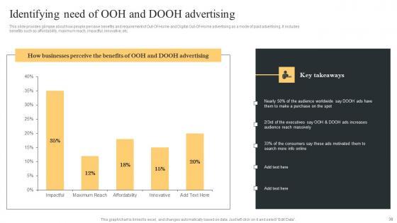 This slide provides glimpse about how people perceive benefits and requirement of Out-Of-Home and Digital Out-Of-Home advertising as a mode of paid advertising. It includes benefits such as affordability, maximum reach, impactful, innovative, etc. Slidegeeks is one of the best resources for PowerPoint templates. You can download easily and regulate Complete Guide Of Paid Media Marketing Techniques Identifying Need Of OOH Ideas PDF for your personal presentations from our wonderful collection. A few clicks is all it takes to discover and get the most relevant and appropriate templates. Use our Templates to add a unique zing and appeal to your presentation and meetings. All the slides are easy to edit and you can use them even for advertisement purposes.