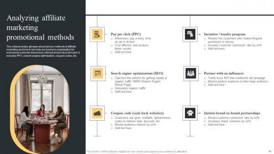 This slide provides glimpse about various methods of affiliate marketing and how it can help our business organization for increasing customer awareness, interest and product demand. It includes PPC, search engine optimization, coupon codes, etc. Here you can discover an assortment of the finest PowerPoint and Google Slides templates. With these templates, you can create presentations for a variety of purposes while simultaneously providing your audience with an eye catching visual experience. Download Complete Guide Of Paid Media Marketing Techniques Analyzing Affiliate Marketing Ideas PDF to deliver an impeccable presentation. These templates will make your job of preparing presentations much quicker, yet still, maintain a high level of quality. Slidegeeks has experienced researchers who prepare these templates and write high quality content for you. Later on, you can personalize the content by editing the Complete Guide Of Paid Media Marketing Techniques Analyzing Affiliate Marketing Ideas PDF.