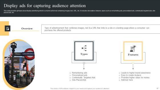 This slide provides glimpse about display advertising which is a hybrid ad format containing images, text, URL, etc. It includes description, features, types such as remarketing ads, personalized ads, contextually targeted ads, site placed ads, etc. There are so many reasons you need a Complete Guide Of Paid Media Marketing Techniques Display Ads For Capturing Template PDF. The first reason is you can not spend time making everything from scratch, Thus, Slidegeeks has made presentation templates for you too. You can easily download these templates from our website easily.