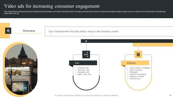 This slide provides glimpse about video advertising which displays a short video about the brand, message or product to the masses. It includes description, features, types such as in-stream ads, non-linear ads, rewarded ads, native video ads, etc. The Complete Guide Of Paid Media Marketing Techniques Video Ads For Increasing Elements PDF is a compilation of the most recent design trends as a series of slides. It is suitable for any subject or industry presentation, containing attractive visuals and photo spots for businesses to clearly express their messages. This template contains a variety of slides for the user to input data, such as structures to contrast two elements, bullet points, and slides for written information. Slidegeeks is prepared to create an impression.