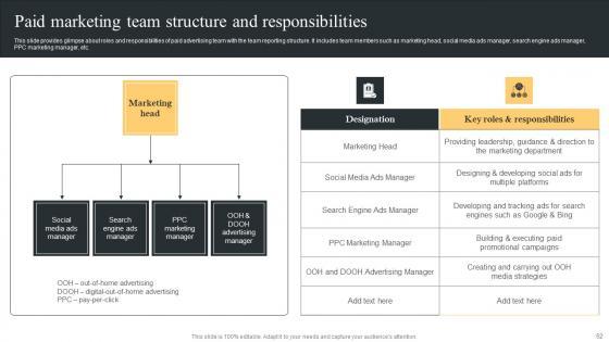 This slide provides glimpse about roles and responsibilities of paid advertising team with the team reporting structure. It includes team members such as marketing head, social media ads manager, search engine ads manager, PPC marketing manager, etc. From laying roadmaps to briefing everything in detail, our templates are perfect for you. You can set the stage with your presentation slides. All you have to do is download these easy to edit and customizable templates. Complete Guide Of Paid Media Marketing Techniques Paid Marketing Team Guidelines PDF will help you deliver an outstanding performance that everyone would remember and praise you for. Do download this presentation today.