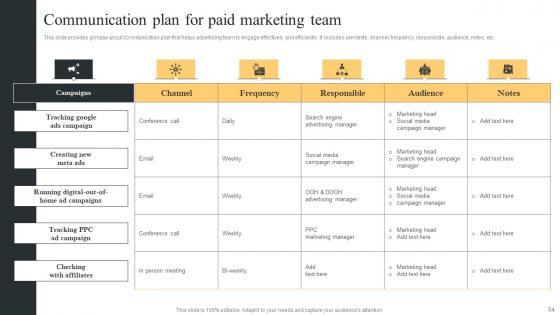 This slide provides glimpse about communication plan that helps advertising team to engage effectively and efficiently. It includes elements, channel, frequency, responsible, audience, notes, etc. Create an editable Complete Guide Of Paid Media Marketing Techniques Communication Plan Download PDF that communicates your idea and engages your audience. Whether you are presenting a business or an educational presentation, pre designed presentation templates help save time. Complete Guide Of Paid Media Marketing Techniques Communication Plan Download PDF is highly customizable and very easy to edit, covering many different styles from creative to business presentations. Slidegeeks has creative team members who have crafted amazing templates. So, go and get them without any delay.