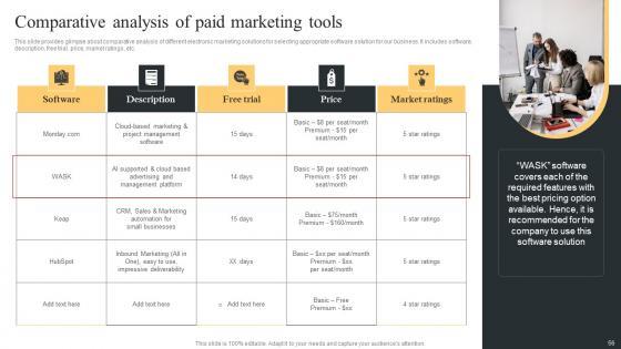 This slide provides glimpse about comparative analysis of different electronic marketing solutions for selecting appropriate software solution for our business. It includes software, description, free trial, price, market ratings, etc. Boost your pitch with our creative Complete Guide Of Paid Media Marketing Techniques Comparative Analysis Of Paid Microsoft PDF. Deliver an awe inspiring pitch that will mesmerize everyone. Using these presentation templates you will surely catch everyones attention. You can browse the ppts collection on our website. We have researchers who are experts at creating the right content for the templates. So you do not have to invest time in any additional work. Just grab the template now and use them.