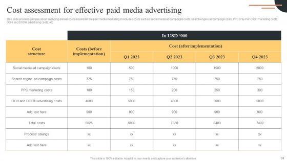 This slide provides glimpse about analyzing annual costs incurred in the paid media marketing. It includes costs such as social media ad campaigns costs, search engine ad campaign costs, PPC Pay-Per-Click marketing costs, OOH and DOOH advertising costs, etc. Create an editable Complete Guide Of Paid Media Marketing Techniques Cost Assessment For Effective Inspiration PDF that communicates your idea and engages your audience. Whether you are presenting a business or an educational presentation, pre designed presentation templates help save time. Complete Guide Of Paid Media Marketing Techniques Cost Assessment For Effective Inspiration PDF is highly customizable and very easy to edit, covering many different styles from creative to business presentations. Slidegeeks has creative team members who have crafted amazing templates. So, go and get them without any delay.