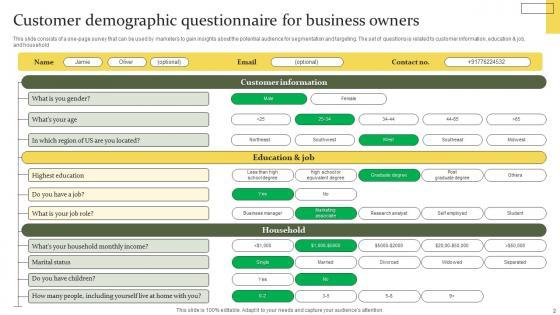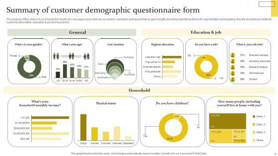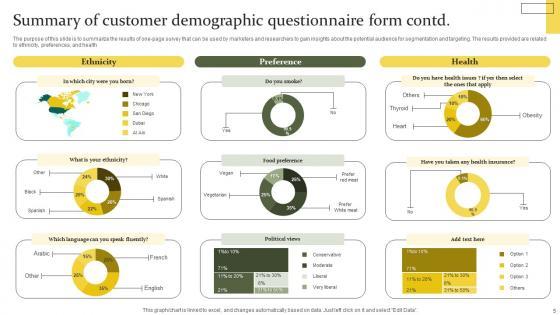 This Demographic Questionnaire Ppt Powerpoint Presentation Complete Deck With Slides acts as backup support for your ideas, vision, thoughts, etc. Use it to present a thorough understanding of the topic. This PPT slideshow can be utilized for both in-house and outside presentations depending upon your needs and business demands. Entailing five slides with a consistent design and theme, this template will make a solid use case. As it is intuitively designed, it suits every business vertical and industry. All you have to do is make a few tweaks in the content or any other component to design unique presentations. The biggest advantage of this complete deck is that it can be personalized multiple times once downloaded. The color, design, shapes, and other elements are free to modify to add personal touches. You can also insert your logo design in this PPT layout. Therefore a well-thought and crafted presentation can be delivered with ease and precision by downloading this Demographic Questionnaire Ppt Powerpoint Presentation Complete Deck With Slides PPT slideshow. Our Demographic Questionnaire Ppt Powerpoint Presentation Complete Deck With Slides are topically designed to provide an attractive backdrop to any subject. Use them to look like a presentation pro.