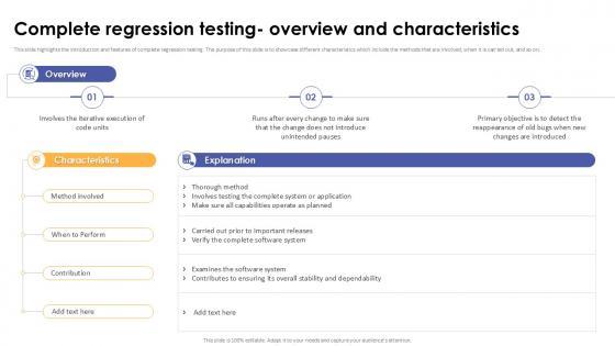 This slide highlights the introduction and features of complete regression testing. The purpose of this slide is to showcase different characteristics which include the methods that are involved, when it is carried out, and so on. Are you in need of a template that can accommodate all of your creative concepts This one is crafted professionally and can be altered to fit any style. Use it with Google Slides or PowerPoint. Include striking photographs, symbols, depictions, and other visuals. Fill, move around, or remove text boxes as desired. Test out color palettes and font mixtures. Edit and save your work, or work with colleagues. Download Complete Regression Testing Overview And Characteristics Corrective Regression Testing Ppt Slide and observe how to make your presentation outstanding. Give an impeccable presentation to your group and make your presentation unforgettable. This slide highlights the introduction and features of complete regression testing. The purpose of this slide is to showcase different characteristics which include the methods that are involved, when it is carried out, and so on.