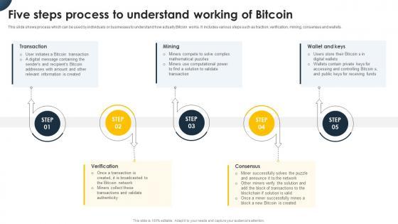This slide shows process which can be used by individuals or businesses to understand how actually Bitcoin works. It includes various steps such as traction, verification, mining, consensus and wallets. Make sure to capture your audiences attention in your business displays with our gratis customizable Complete Beginners Guide Five Steps Process To Understand Working Of Bitcoin Fin SS V. These are great for business strategies, office conferences, capital raising or task suggestions. If you desire to acquire more customers for your tech business and ensure they stay satisfied, create your own sales presentation with these plain slides. This slide shows process which can be used by individuals or businesses to understand how actually Bitcoin works. It includes various steps such as traction, verification, mining, consensus and wallets.