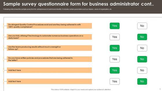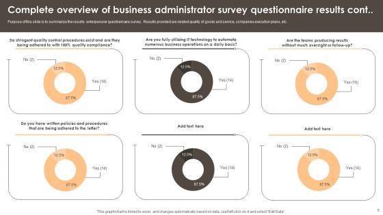 Boost your confidence and team morale with this well-structured Survey Questionnaire For Business Administrator Ppt Powerpoint Presentation Complete Deck With Slides Survey This prefabricated set gives a voice to your presentation because of its well-researched content and graphics. Our experts have added all the components very carefully, thus helping you deliver great presentations with a single click. Not only that, it contains a set of five slides that are designed using the right visuals, graphics, etc. Various topics can be discussed, and effective brainstorming sessions can be conducted using the wide variety of slides added in this complete deck. Apart from this, our PPT design contains clear instructions to help you restructure your presentations and create multiple variations. The color, format, design anything can be modified as deemed fit by the user. Not only this, it is available for immediate download. So, grab it now. Our Survey Questionnaire For Business Administrator Ppt Powerpoint Presentation Complete Deck With Slides Survey are topically designed to provide an attractive backdrop to any subject. Use them to look like a presentation pro.