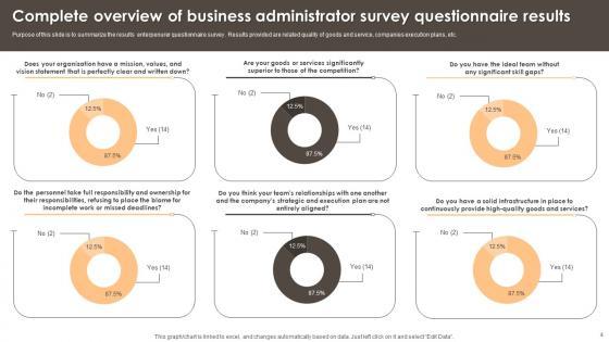 Purpose of this slide is to summarize the results enterpenurer questionnaire survey. Results provided are related quality of goods and service, companies execution plans, etc. Showcasing this set of slides titled Complete Overview Of Business Administrator Survey Questionnaire Results Survey Ss The topics addressed in these templates are Organization, Competition, Significant Skill All the content presented in this PPT design is completely editable. Download it and make adjustments in color, background, font etc. as per your unique business setting. Purpose of this slide is to summarize the results enterpenurer questionnaire survey. Results provided are related quality of goods and service, companies execution plans, etc.