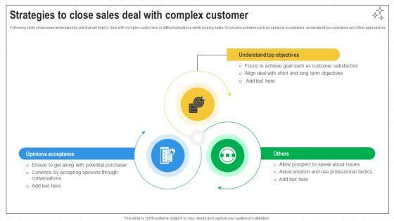 Following slide showcases techniques to use that will help to deal with complex customers or difficult situations while closing sales. It includes pointers such as opinions acceptance, understand top objectives and other approaches. Get a simple yet stunning designed Closing Techniques To Seal Strategies To Close Sales Deal With Complex Customer SA SS V. It is the best one to establish the tone in your meetings. It is an excellent way to make your presentations highly effective. So, download this PPT today from Slidegeeks and see the positive impacts. Our easy-to-edit Closing Techniques To Seal Strategies To Close Sales Deal With Complex Customer SA SS V can be your go-to option for all upcoming conferences and meetings. So, what are you waiting for Grab this template today. Following slide showcases techniques to use that will help to deal with complex customers or difficult situations while closing sales. It includes pointers such as opinions acceptance, understand top objectives and other approaches.