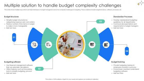 This slide shows multiple ways which can help individuals or budget managers to overcome complexity challenges in budgeting. These solutions include budget structures, software, processes, etc. Are you searching for a Multiple Solution To Handle Budget Complexity Effective And Efficient Tools To Develop Fin SS V that is uncluttered, straightforward, and original Its easy to edit, and you can change the colors to suit your personal or business branding. For a presentation that expresses how much effort you have put in, this template is ideal With all of its features, including tables, diagrams, statistics, and lists, its perfect for a business plan presentation. Make your ideas more appealing with these professional slides. Download Multiple Solution To Handle Budget Complexity Effective And Efficient Tools To Develop Fin SS V from Slidegeeks today. This slide shows multiple ways which can help individuals or budget managers to overcome complexity challenges in budgeting. These solutions include budget structures, software, processes, etc.