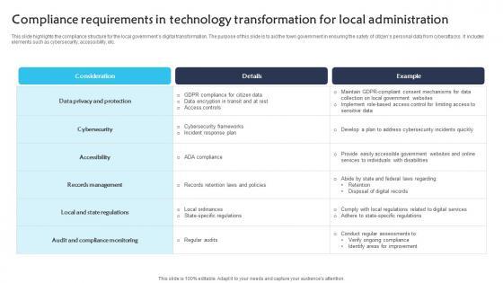 This slide highlights the compliance structure for the local governments digital transformation. The purpose of this slide is to aid the town government in ensuring the safety of citizens personal data from cyberattacks. It includes elements such as cybersecurity, accessibility, etc. Pitch your topic with ease and precision using this Compliance Requirements In Technology Transformation For Local Administration Summary pdf. This layout presents information on Consideration, Cybersecurity, Accessibility. It is also available for immediate download and adjustment. So, changes can be made in the color, design, graphics or any other component to create a unique layout. This slide highlights the compliance structure for the local governments digital transformation. The purpose of this slide is to aid the town government in ensuring the safety of citizens personal data from cyberattacks. It includes elements such as cybersecurity, accessibility, etc.