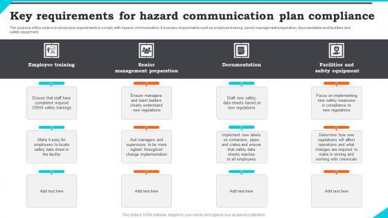 The purpose of this slide is to showcase requirements to comply with hazard communication. It includes requirements such as employee training, senior management preparation, documentation and facilities and safety equipment. Pitch your topic with ease and precision using this Key Requirements For Hazard Communication Plan Compliance Ppt Icon Graphics Pdf. This layout presents information on Senior Management Preparation, Documentation And Facilities, Safety Equipment. It is also available for immediate download and adjustment. So, changes can be made in the color, design, graphics or any other component to create a unique layout. The purpose of this slide is to showcase requirements to comply with hazard communication. It includes requirements such as employee training, senior management preparation, documentation and facilities and safety equipment.