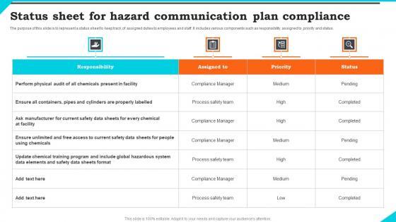The purpose of this slide is to represent a status sheet to keep track of assigned duties to employees and staff. It includes various components such as responsibility, assigned to, priority and status. Showcasing this set of slides titled Status Sheet For Hazard Communication Plan Compliance Ppt Ideas Guide Pdf. The topics addressed in these templates are Perform Physical Audit, Chemicals Present, Ensure Unlimite. All the content presented in this PPT design is completely editable. Download it and make adjustments in color, background, font etc. as per your unique business setting. The purpose of this slide is to represent a status sheet to keep track of assigned duties to employees and staff. It includes various components such as responsibility, assigned to, priority and status.