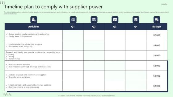 The following slide outlines a timeline to attain supplier performance management goals of business for growth and development. It showcases activities such as supplier contract review, negotiations, new supplier identification, relationship development and contract finalization. Welcome to our selection of the Timeline Plan To Comply With Supplier Power Themes PDF. These are designed to help you showcase your creativity and bring your sphere to life. Planning and Innovation are essential for any business that is just starting out. This collection contains the designs that you need for your everyday presentations. All of our PowerPoints are 100 percent editable, so you can customize them to suit your needs. This multi-purpose template can be used in various situations. Grab these presentation templates today