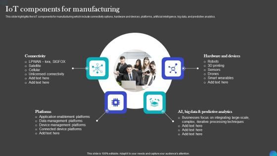 This slide highlights the IoT components for manufacturing which include connectivity options, hardware and devices, platforms, artificial intelligence, big data, and predictive analytics. Here you can discover an assortment of the finest PowerPoint and Google Slides templates. With these templates, you can create presentations for a variety of purposes while simultaneously providing your audience with an eye catching visual experience. Download Iot Applications For Manufacturing Industry Iot Components For Manufacturing Infographics PDF to deliver an impeccable presentation. These templates will make your job of preparing presentations much quicker, yet still, maintain a high level of quality. Slidegeeks has experienced researchers who prepare these templates and write high quality content for you. Later on, you can personalize the content by editing the Iot Applications For Manufacturing Industry Iot Components For Manufacturing Infographics PDF.