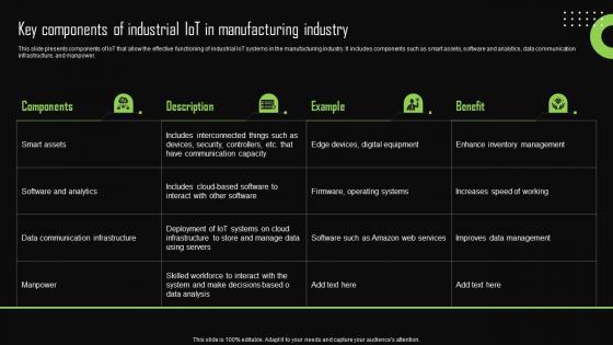 This slide presents components of IoT that allow the effective functioning of industrial IoT systems in the manufacturing industry. It includes components such as smart assets, software and analytics, data communication infrastructure, and manpower. Slidegeeks is here to make your presentations a breeze with Key Components Of Industrial Iot In Manufacturing Iot Device Management Download Pdf With our easy-to-use and customizable templates, you can focus on delivering your ideas rather than worrying about formatting. With a variety of designs to choose from, you are sure to find one that suits your needs. And with animations and unique photos, illustrations, and fonts, you can make your presentation pop. So whether you are giving a sales pitch or presenting to the board, make sure to check out Slidegeeks first This slide presents components of IoT that allow the effective functioning of industrial IoT systems in the manufacturing industry. It includes components such as smart assets, software and analytics, data communication infrastructure, and manpower.