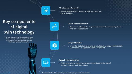 This slide represents the key components of digital twin technology, and it includes the model of a physical object, data series information, unique identifier, and capacity for monitoring. Slidegeeks is here to make your presentations a breeze with Key Components Of Digital Twin Technology Ppt PowerPoint Presentation File Background Images PDF With our easy to use and customizable templates, you can focus on delivering your ideas rather than worrying about formatting. With a variety of designs to choose from, you are sure to find one that suits your needs. And with animations and unique photos, illustrations, and fonts, you can make your presentation pop. So whether you are giving a sales pitch or presenting to the board, make sure to check out Slidegeeks first.