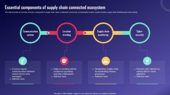 This slide provides an overview of the key components of supply chain. Major components covered are communication system, location tracking, supply chain monitoring and cyber security . Whether you have daily or monthly meetings, a brilliant presentation is necessary. Essential Components Of Supply IoT Fleet Monitoring Ppt Example IoT SS V can be your best option for delivering a presentation. Represent everything in detail using Essential Components Of Supply IoT Fleet Monitoring Ppt Example IoT SS V and make yourself stand out in meetings. The template is versatile and follows a structure that will cater to your requirements. All the templates prepared by Slidegeeks are easy to download and edit. Our research experts have taken care of the corporate themes as well. So, give it a try and see the results. This slide provides an overview of the key components of supply chain. Major components covered are communication system, location tracking, supply chain monitoring and cyber security