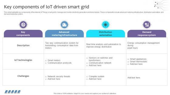 This slide highlights key components of the Internet of Things smart grid to manage and monitor electricity generation and transmission. These components include advanced metering infrastructure, distribution automation, and demand response system. Retrieve professionally designed Key Components Of IoT Driven Smart Grid Internet Of Things Solutions To Enhance Energy IoT SS V to effectively convey your message and captivate your listeners. Save time by selecting pre-made slideshows that are appropriate for various topics, from business to educational purposes. These themes come in many different styles, from creative to corporate, and all of them are easily adjustable and can be edited quickly. Access them as PowerPoint templates or as Google Slides themes. You do not have to go on a hunt for the perfect presentation because Slidegeeks got you covered from everywhere. This slide highlights key components of the Internet of Things smart grid to manage and monitor electricity generation and transmission. These components include advanced metering infrastructure, distribution automation, and demand response system.