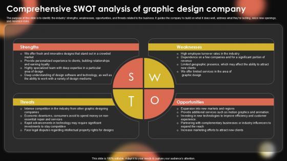 The purpose of this slide is to identify the industry strengths, weaknesses, opportunities, and threats related to the business. It guides the company to build on what it does well, address what they are lacking, seize new openings, and minimize risks. There are so many reasons you need a Creative Agency Business Plan Comprehensive SWOT Analysis Of Graphic Design Company BP SS V. The first reason is you can not spend time making everything from scratch, Thus, Slidegeeks has made presentation templates for you too. You can easily download these templates from our website easily. The purpose of this slide is to identify the industry strengths, weaknesses, opportunities, and threats related to the business. It guides the company to build on what it does well, address what they are lacking, seize new openings, and minimize risks.