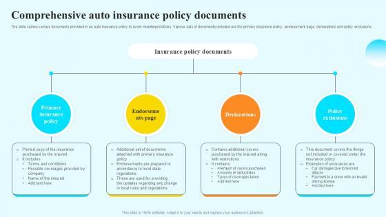 The slide carries various documents provided in an auto insurance policy to avoid misinterpretations. Various sets of documents included are the primary insurance policy, endorsement page, declarations and policy exclusions. Slidegeeks is here to make your presentations a breeze with Comprehensive Auto Insurance Steps By Step Guide For Claiming Car PPT Example With our easy-to-use and customizable templates, you can focus on delivering your ideas rather than worrying about formatting. With a variety of designs to choose from, you are sure to find one that suits your needs. And with animations and unique photos, illustrations, and fonts, you can make your presentation pop. So whether you are giving a sales pitch or presenting to the board, make sure to check out Slidegeeks first The slide carries various documents provided in an auto insurance policy to avoid misinterpretations. Various sets of documents included are the primary insurance policy, endorsement page, declarations and policy exclusions.