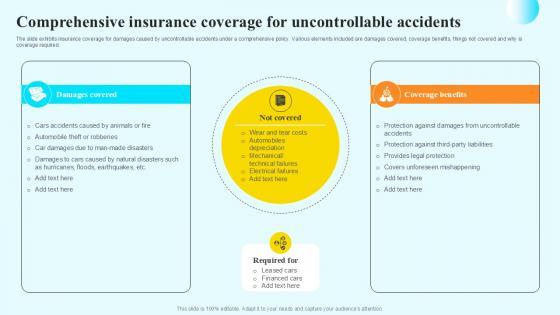 The slide exhibits insurance coverage for damages caused by uncontrollable accidents under a comprehensive policy. Various elements included are damages covered, coverage benefits, things not covered and why is coverage required. Do you have an important presentation coming up Are you looking for something that will make your presentation stand out from the rest Look no further than Comprehensive Insurance Coverage Steps By Step Guide For Claiming Car PPT Slide. With our professional designs, you can trust that your presentation will pop and make delivering it a smooth process. And with Slidegeeks, you can trust that your presentation will be unique and memorable. So why wait Grab Comprehensive Insurance Coverage Steps By Step Guide For Claiming Car PPT Slide today and make your presentation stand out from the rest The slide exhibits insurance coverage for damages caused by uncontrollable accidents under a comprehensive policy. Various elements included are damages covered, coverage benefits, things not covered and why is coverage required.
