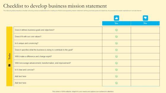 The following slide presents a checklist showing various considerations for creating an effective and appealing mission statement defining business goals and objectives. Its purpose is to explain aspirations in concise manner. Retrieve professionally designed Comprehensive Guide For Sales And Advertising Processes Checklist To Develop Business Mission Statement Pictures PDF to effectively convey your message and captivate your listeners. Save time by selecting pre-made slideshows that are appropriate for various topics, from business to educational purposes. These themes come in many different styles, from creative to corporate, and all of them are easily adjustable and can be edited quickly. Access them as PowerPoint templates or as Google Slides themes. You do not have to go on a hunt for the perfect presentation because Slidegeeks got you covered from everywhere.